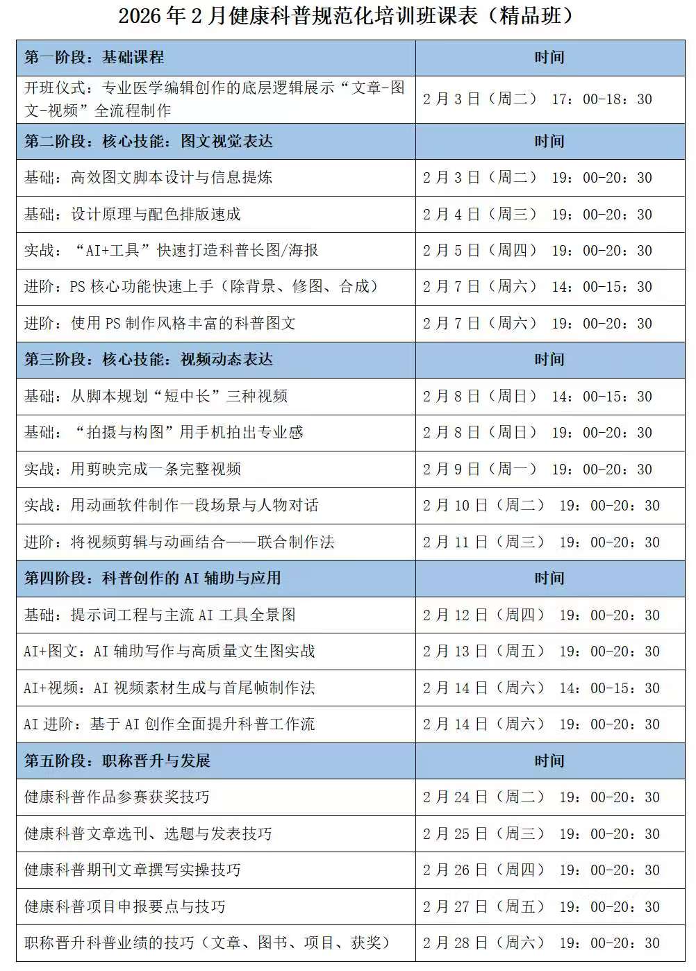 4.科普作品参赛技巧:面向各类大赛准备参赛作品。5.科普项目申报的技巧:如何申报卫健、科协、科技厅的科普项目6.学习使用AI工具辅助科普视频动画、长图的创作。7.职称晋升科普业绩准备技巧(由专家给予学员1v1的业绩筹划指导)